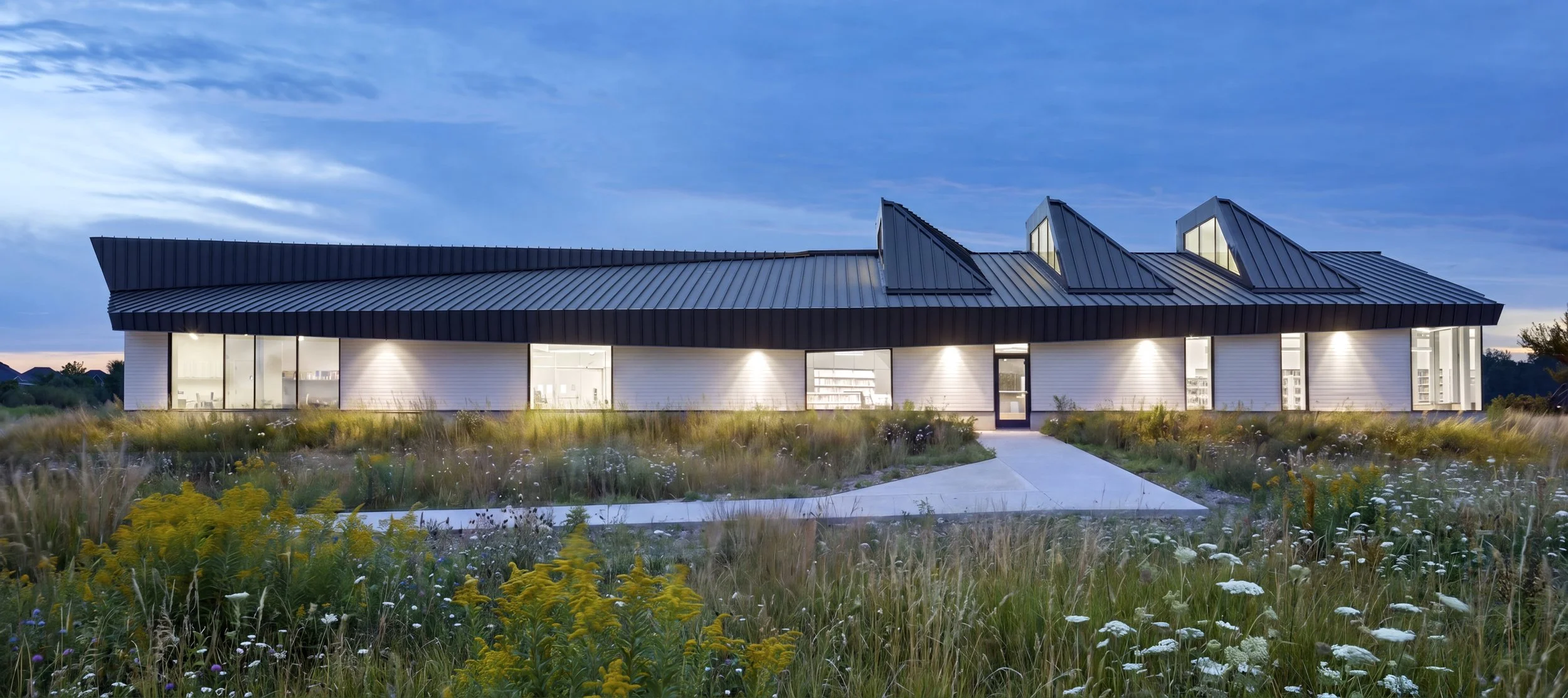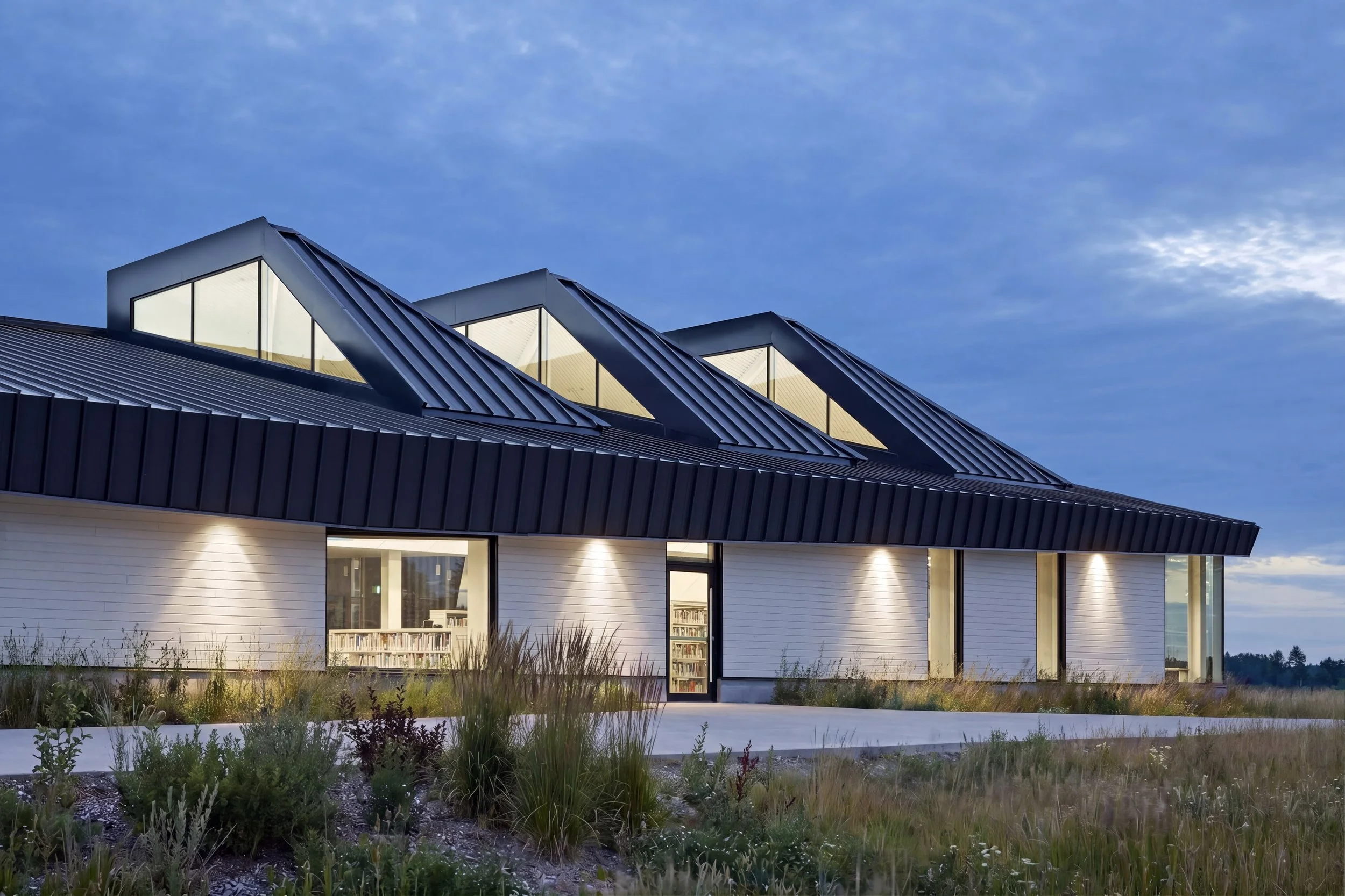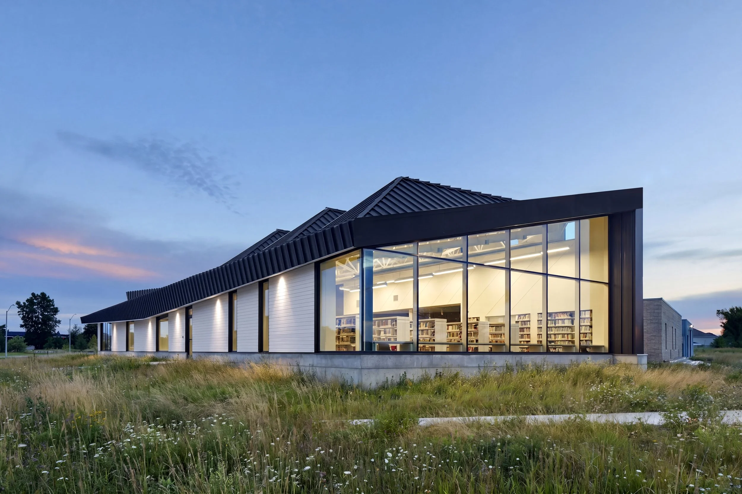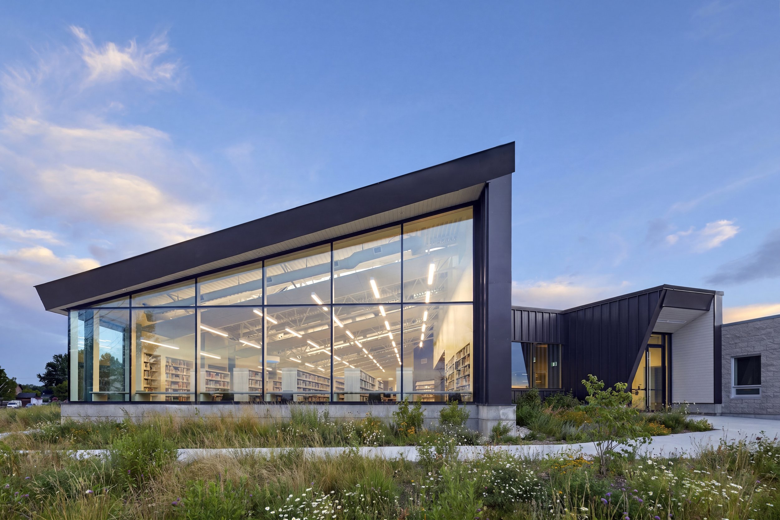 Situating the library to the east of the existing community centre will maximize views to the surrounding landscape. Driven by the typical shed/barn roof typology, the vaulting of the main space allows for natural light to flood the interior space from high clerestory windows while also gesturing to the new, iconic main entrance to the facility.