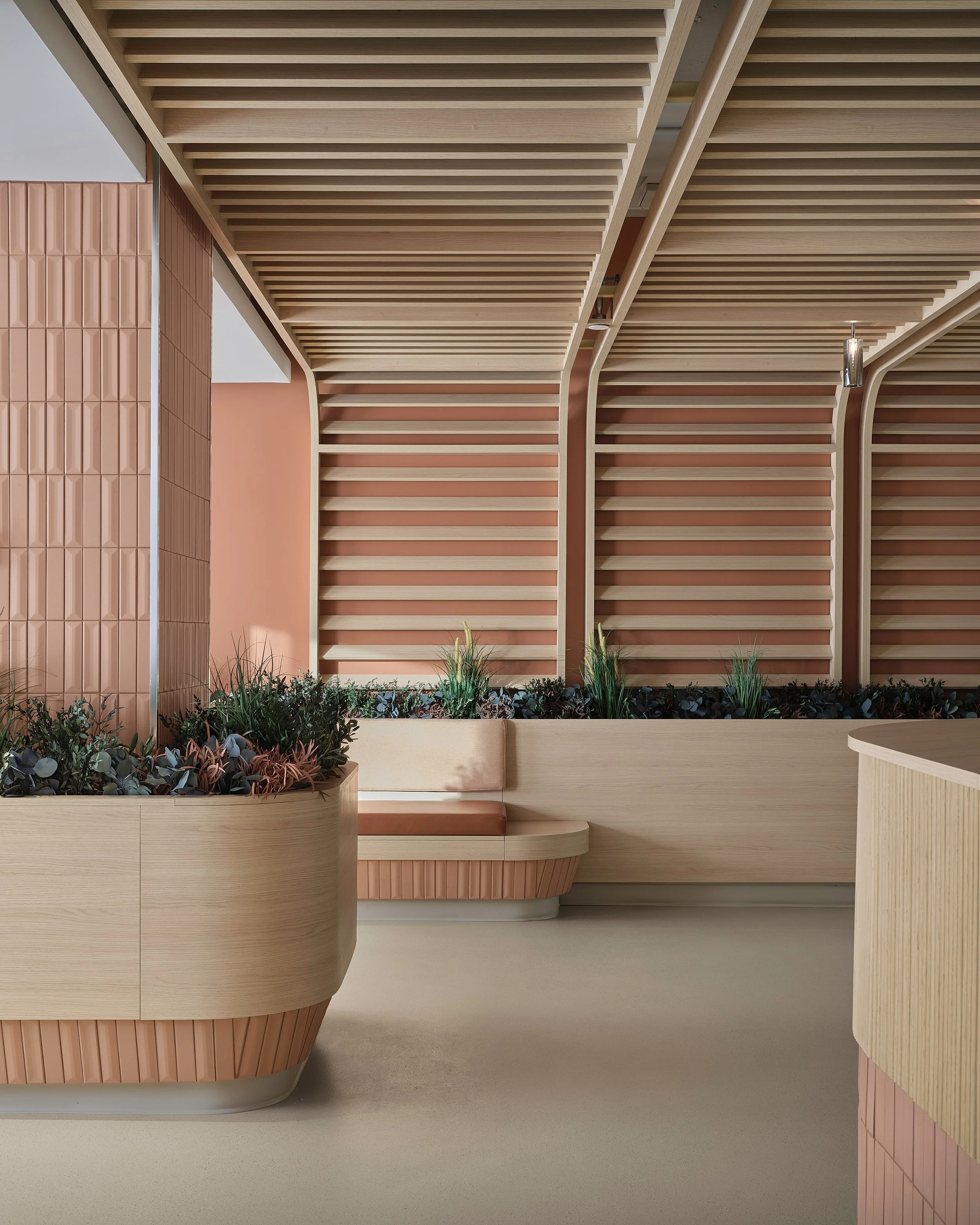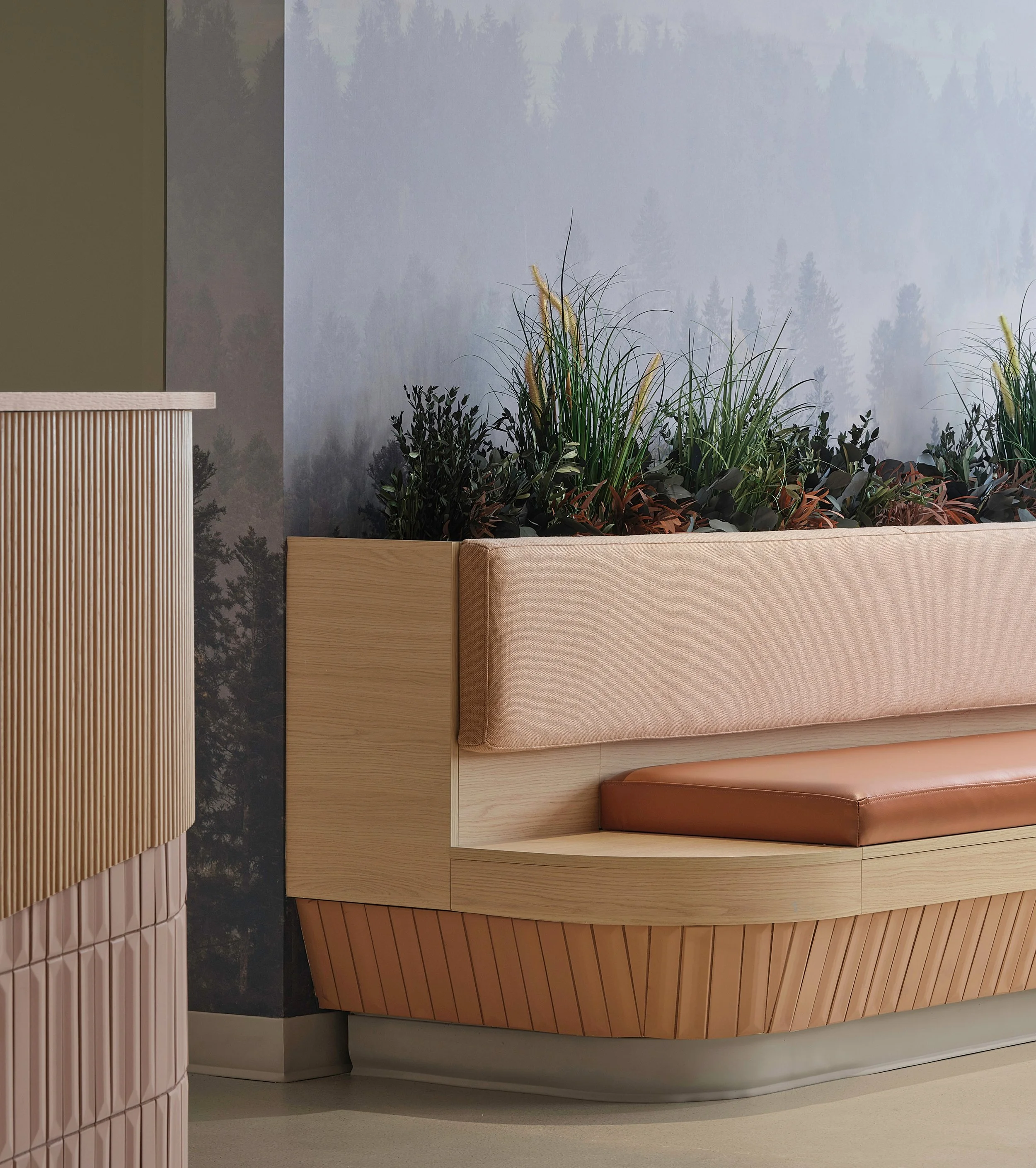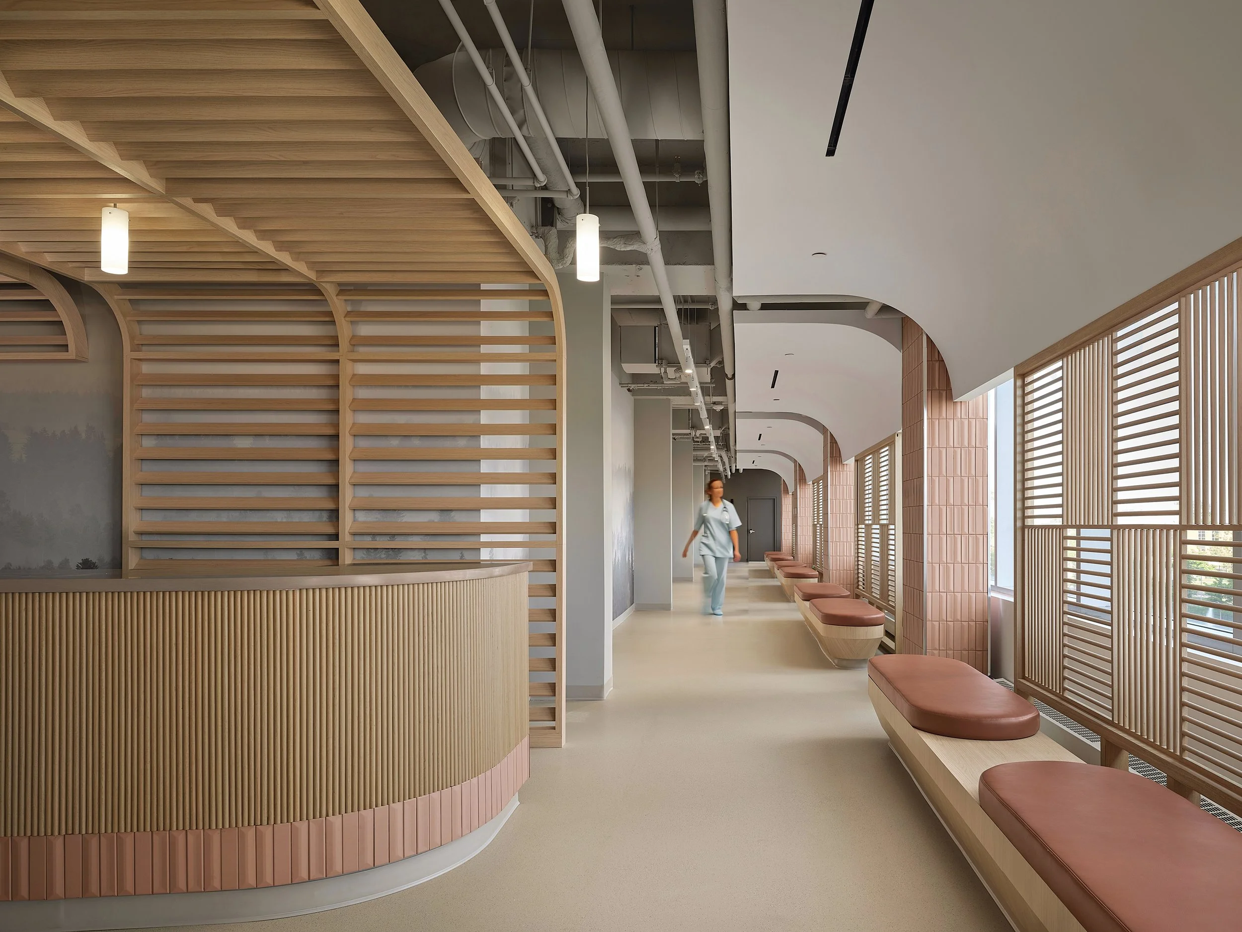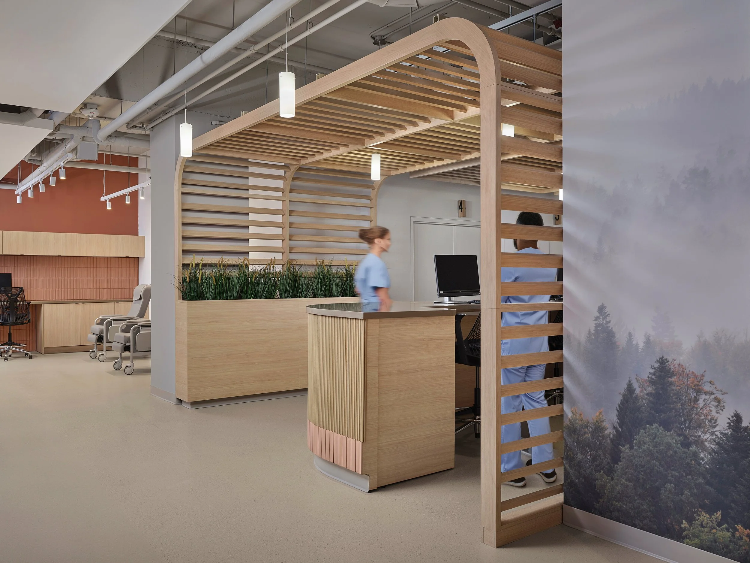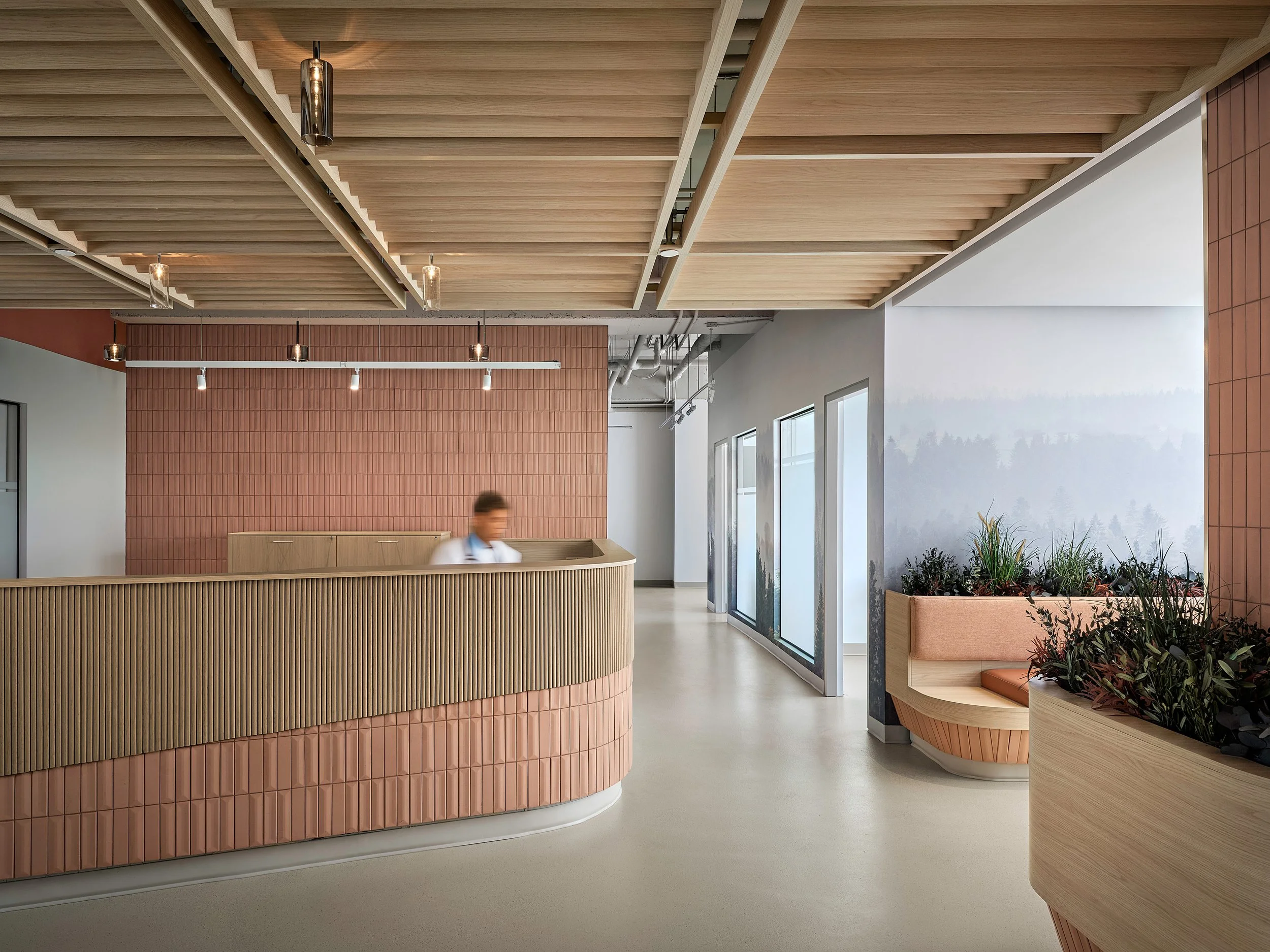 The clinic consists of a primary reception, consultation rooms, procedure and treatment rooms, and an infusion lounge across from the central nursing station. Medical staff areas include offices, meeting rooms and a lounge. Working closely with the partners of the clinic, themes of wellness and health restoration were developed early in the project, setting the tone for natural materials, simplicity of form, texture, a warm colour palette, artistic murals, and interior plantings. Architectural elements were developed as a consistent, branded interior experience to communicate the centre’s mission for compassionate care.