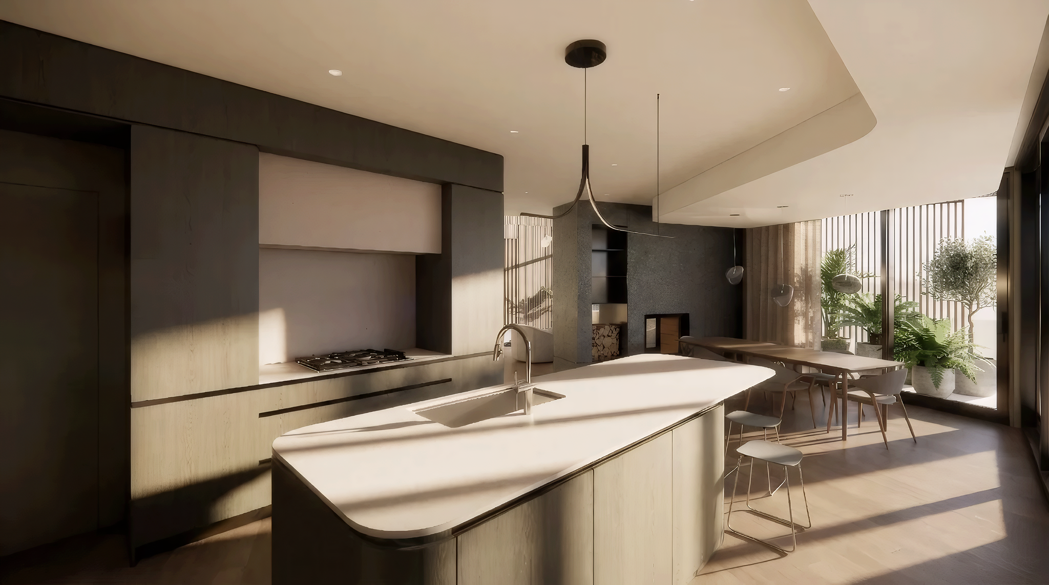 Flow House is a study in movement — of light, of circulation, of time experienced through space. Conceived as a living volume rather than a static object, the home bends gently around its site, opening itself to natural daylight and framing shifting views to the garden. A sculpted envelope of vertical slats wraps the exterior, softening the form and capturing sunlight in subtle gradients through the day, giving the house a quiet, ever-changing presence in the neighbourhood.