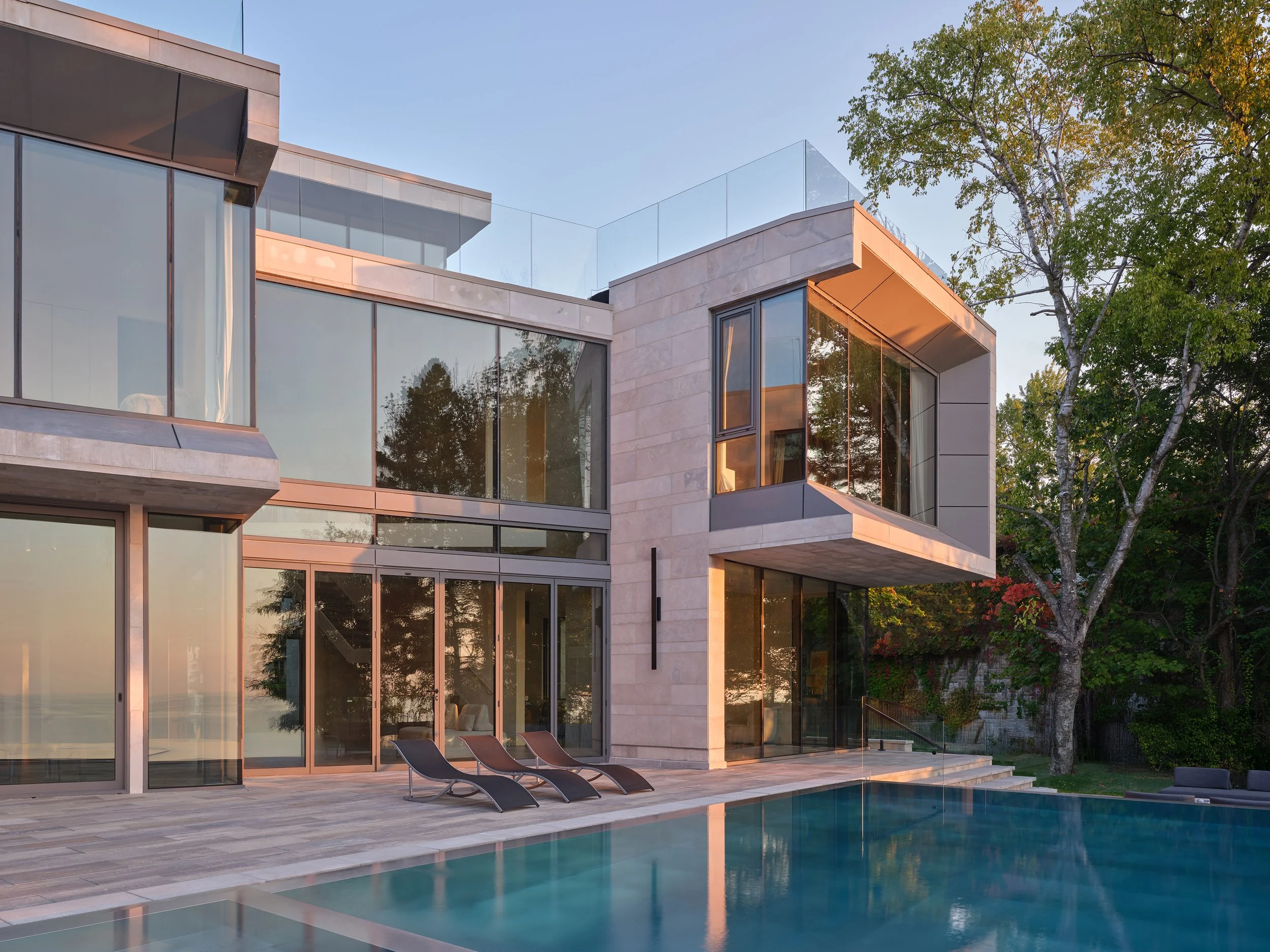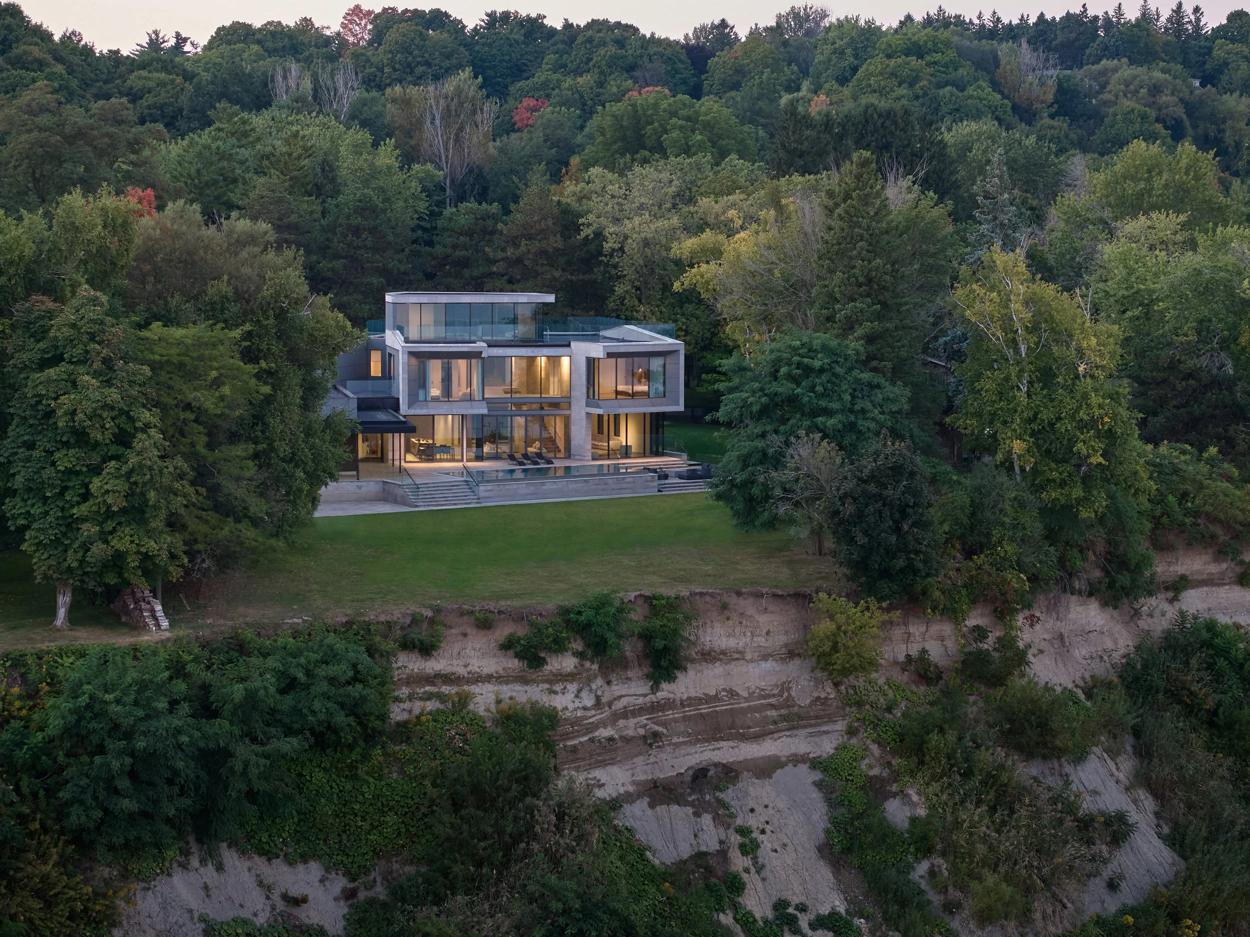 Two solid limestone volumes—quarried locally in Owen Sound—are pulled apart to form a luminous three-storey atrium. This central void carries daylight deep into the plan and creates uninterrupted sightlines from entry to lake, anchoring the family’s daily life across all levels. Bridges span the atrium to connect parents’ and children’s wings, reinforcing openness while preserving intimacy.