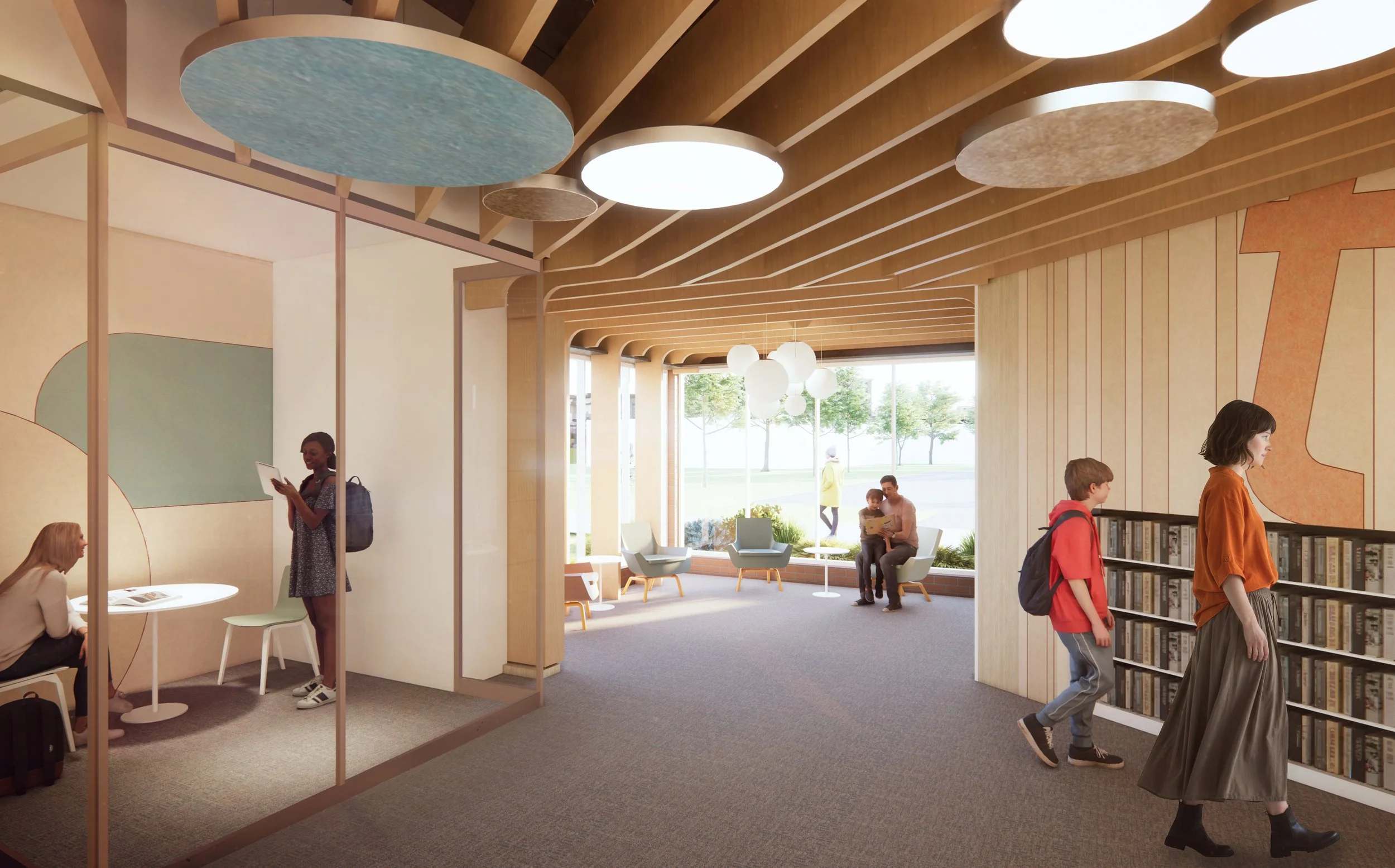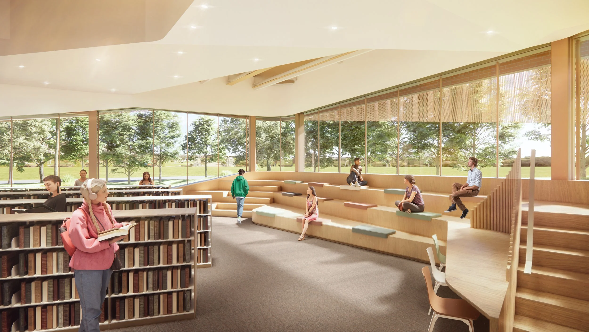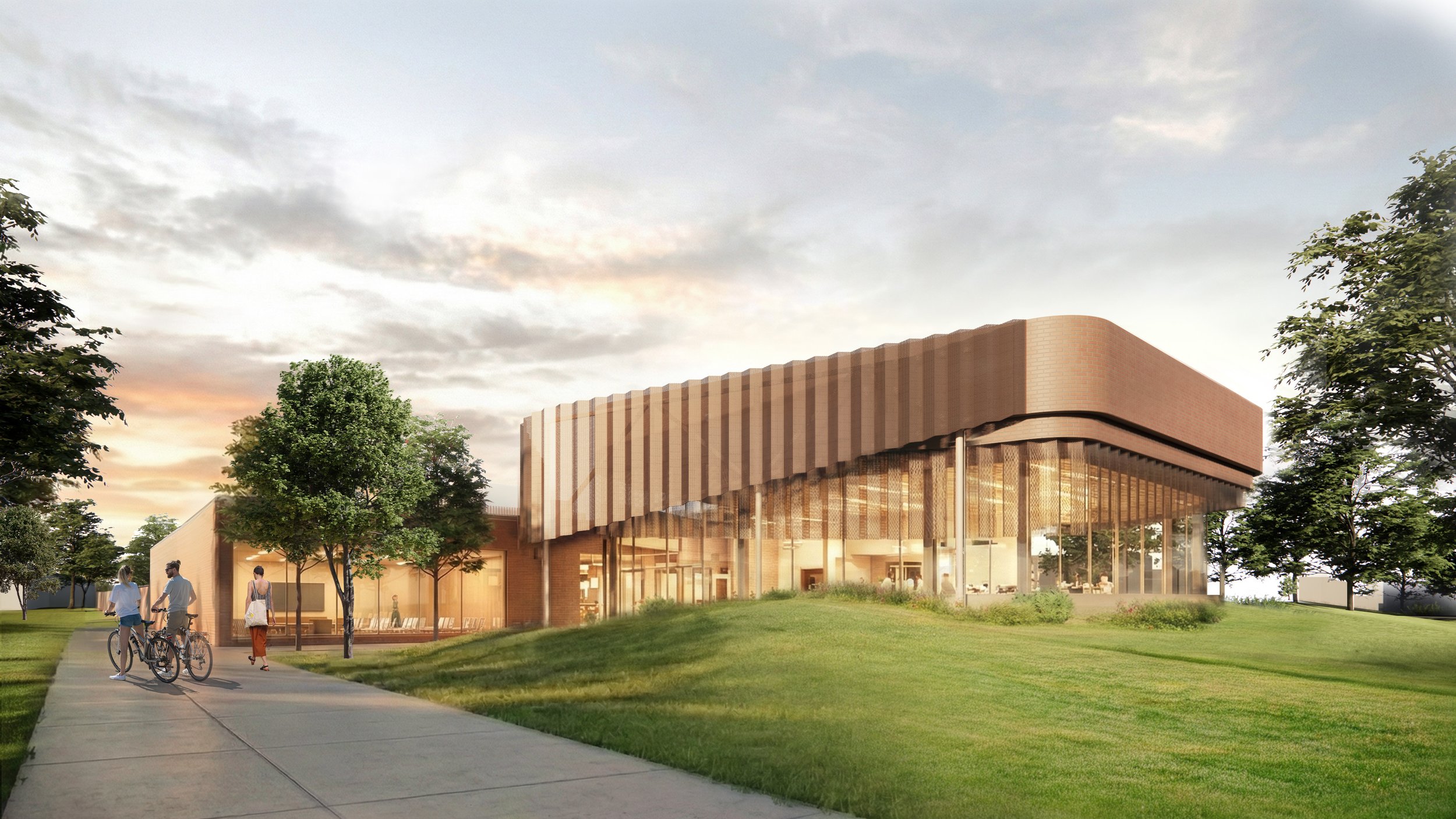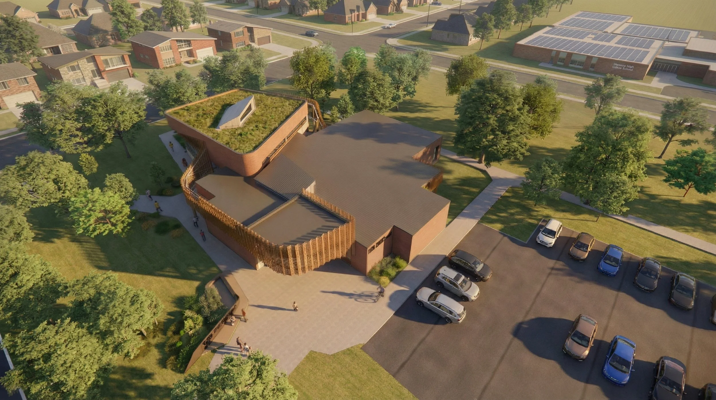 The newly designed space also takes inspiration from the existing berms and green space located around the property, where the library will act as a pavilion in a park. Keeping with the importance of sustainability and green space, the 3,000 sf addition will feature a green roof.