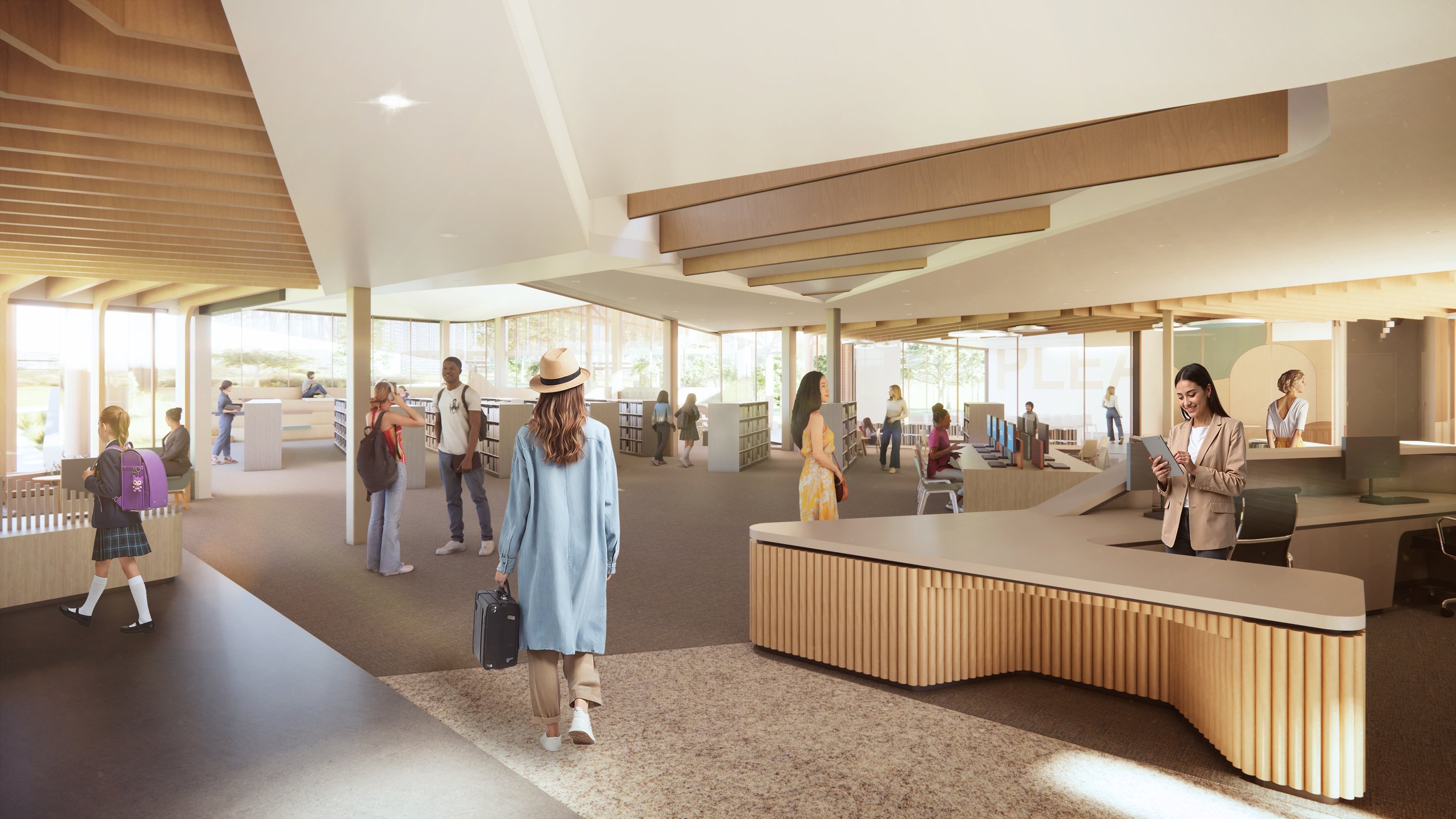 As the sun moves south, a cantilevered screen allows indirect light to stream through the large windows into the Reading Garden and Children’s area. As the sun begins to set in the afternoon, two clerestories light up the Teen areas and study spaces with soft dusk light. Two additional clerestories were added to the existing library building to brighten up the staff areas.