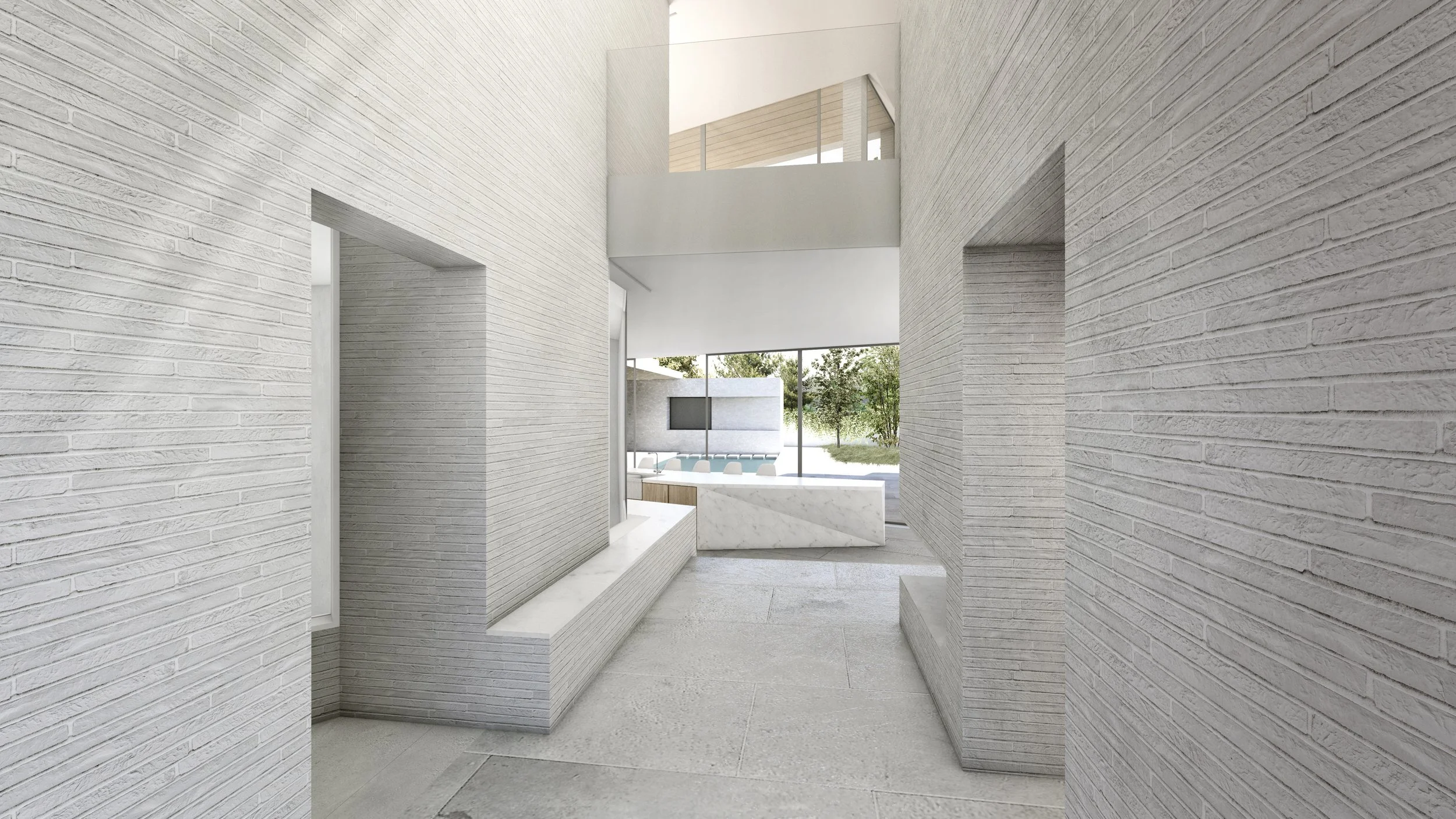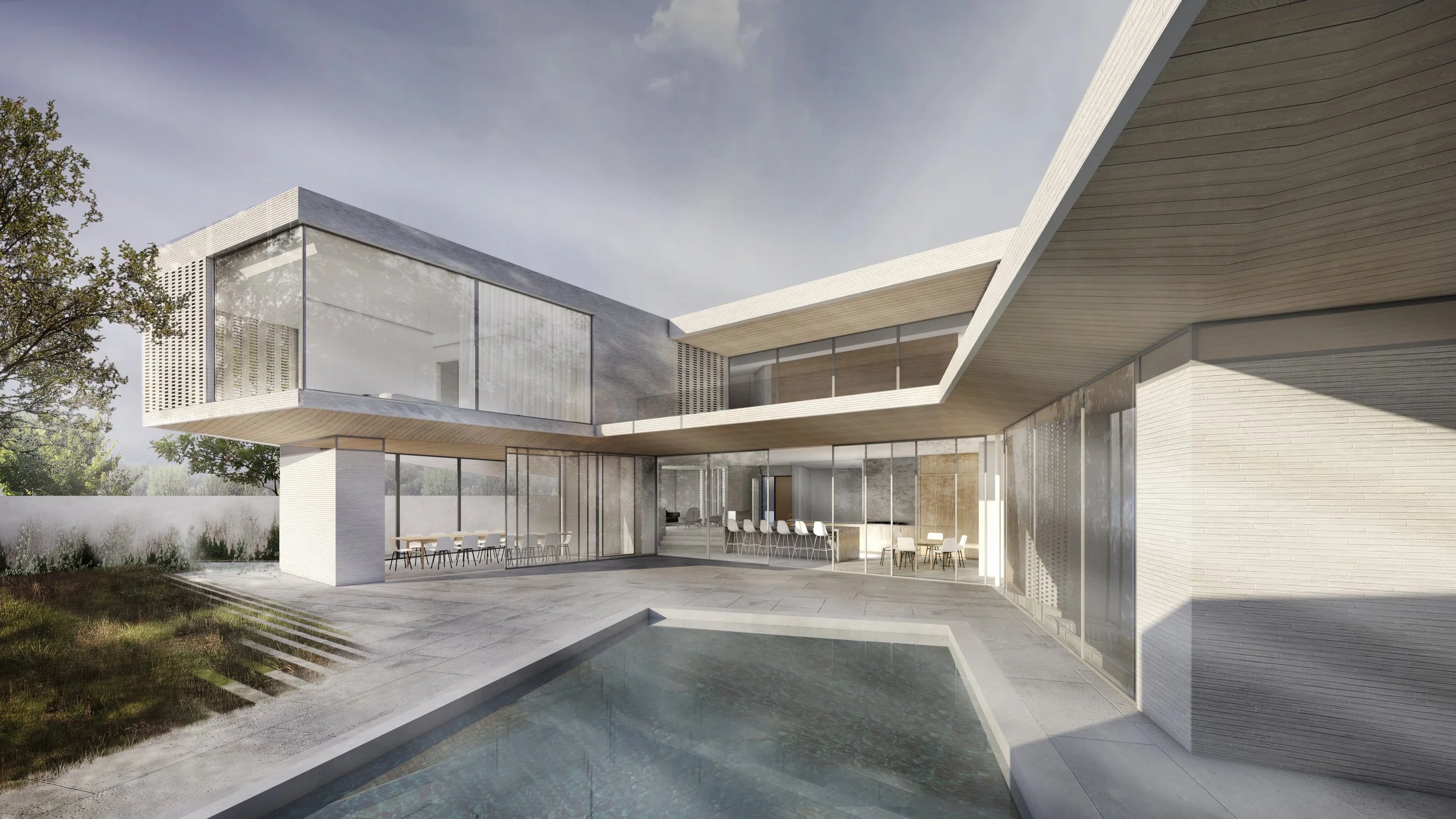The sculptural form originates from a precise reading of sunlight, setbacks, privacy, and program. Corners are cut to open sightlines; the mass shifts off axis to optimize solar gain; and deep incisions along the south facade draw daylight into the interior. These moves support a passive environmental strategy where stone floors collect and redistribute heat, clerestory windows create a natural ventilation chimney, and a green roof manages rainwater while reducing temperature loads. Even the pool participates in the building’s thermal balance, sharing energy with the radiant system seasonally.