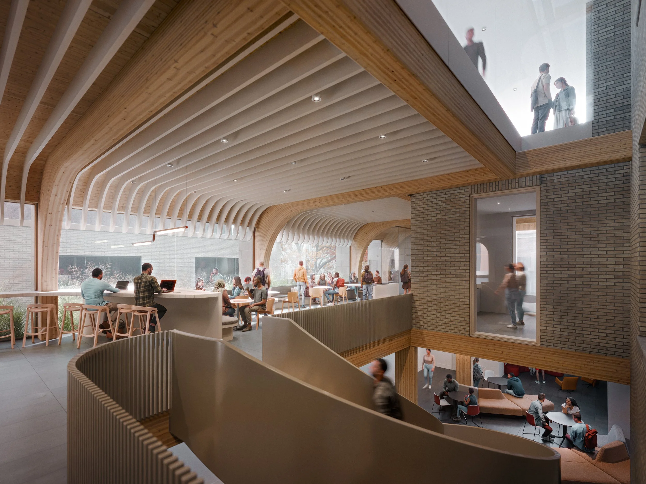 The project addresses the challenge of introducing inclusive, student-facing spaces, collaborative work areas, and consolidated administrative functions within a conserved envelope.